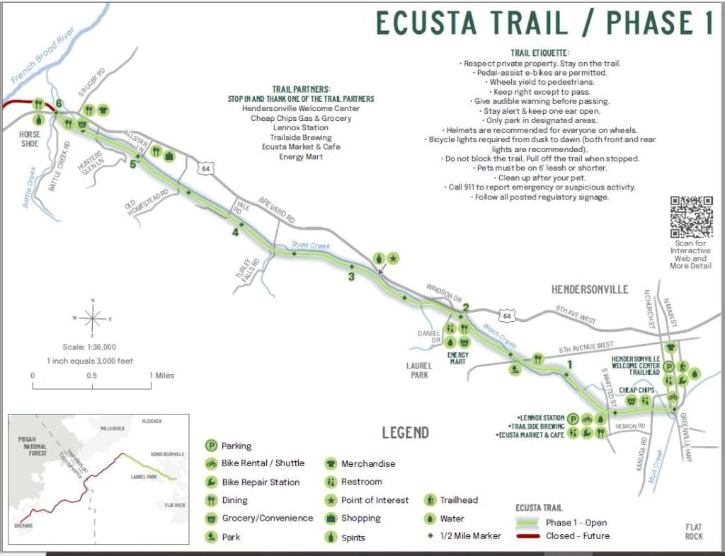 Parking to access Mile 0 can be accessed at the Hendersonville Visitor Center, 201 S Main St, Hendersonville, NC 28792, or roadside parking. There is also parking available at Trailside Brewing Co./Ecusta Market between Mile 0 and Mile 1, 873 Lenox Park Dr, Hendersonville, NC 28739, and between Mile 2 and Mile 3, at Guidon Brewing Outpost 1, 2120 Brevard Rd, Hendersonville, NC 28791.