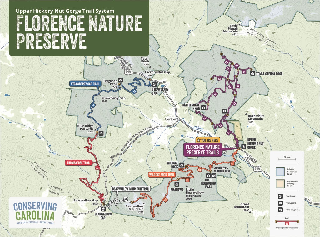 The trails at Florence Nature Preserve connect to the Wildcat Rock Trail, which starts on the other side of the road from the parking area. They are also part of an ambitious emerging trail network in the Hickory Nut Gorge. Conserving Carolina is spearheading efforts to create a 20 mile loop trail in the Upper Hickory Nut Gorge that will connect Florence Nature Preserve, Wildcat Rock Trail, Bearwallow Mountain, the Trombatore Trail, and Blue Ridge Pastures. This loop will be part of the future 100+ Hickory Nut Gorge State Trail, which will one day traverse the whole length of the Hickory Nut Gorge and circumnavigate Lake Lure.