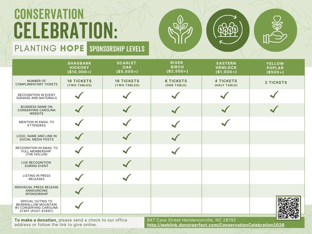 - Exposure to Conserving Carolina’s very engaged social media community and e-Holler Newsletter